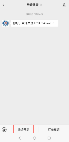 请关注“华理健康”微信服务号,点击“场馆预定”完成有关预定操作。详见下图: