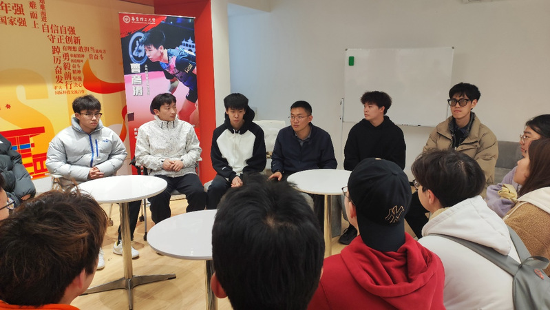 在学生社区“理遇”空间,曹彦涛与同学们进行了一场见面交流会,曹彦涛分享了自己的乒乓球运动经历,分析了专业选手的大赛心理状态,激发同学们对乒乓球的运动热情,他鼓励同学们多参加训练比赛,培养阳光向上的心理素质。随后,他回答了关于专业训练内容、握拍方法与技巧、击球的动作规范等师生关心关切的问题,现场气氛热烈融洽。