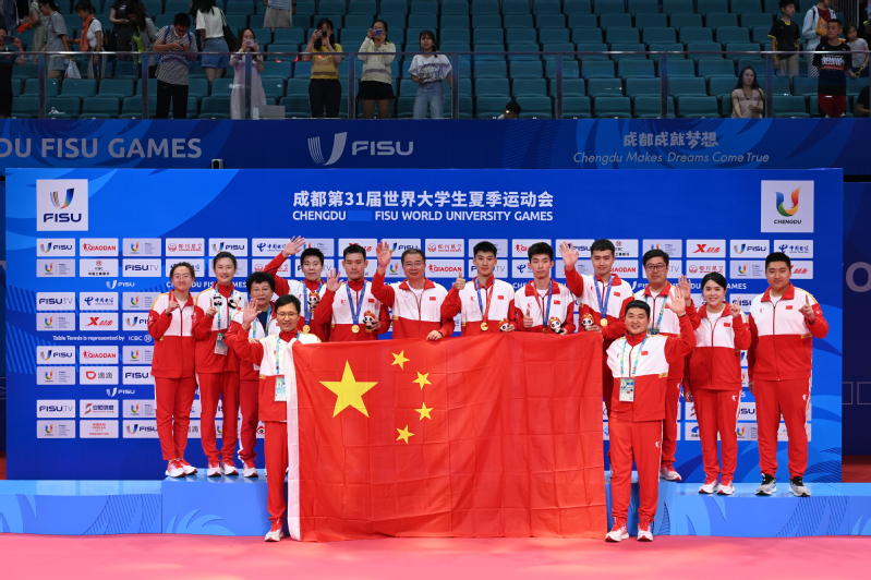 在2023年成都第31届世界大学生夏季运动会期间,该团队负责组建中国乒乓球队,赛场上团队成员披荆斩棘、为国争光,强势包揽乒乓球项目的全部7枚金牌同时收获3枚银牌和3枚铜牌,实现了连续两届大运会乒乓球项目的“全冠王”,不负国球荣耀,圆满完成祖国和人民交予的光荣任务,取得巨大社会效益。开幕式上,该团队负责人马越斐老师凭借连续4届获得世界大学生运动会冠军的经历,担任执旗手,在习近平总书记的注视下,与奥运冠军苏翊鸣等共同护送国际大学生联合会会旗入场。赛后,受邀参加中央电视台“大运英豪”节目专访,讲述作为运动员和教练员双重身份参加6届世界大学生运动会的故事,分享教学经验与带队感悟。优秀事迹被《人民日报》、《光明日报》、《文汇报》、《中国青年报》等媒体相继报道,形成良好的社会反响。