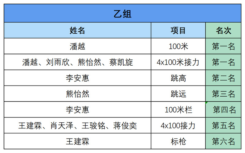 本次比赛分为:甲组(阳光组),乙组(高水平组、超级组)。在为期两天的角逐中,田径队的同学们奋勇拼搏,成绩斐然。
