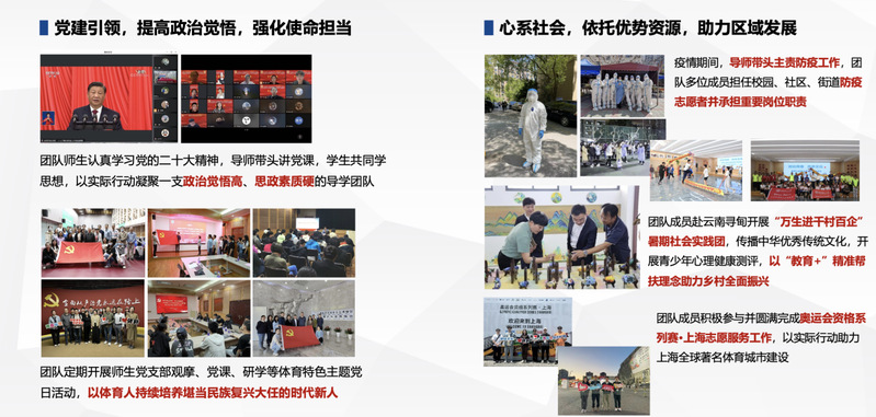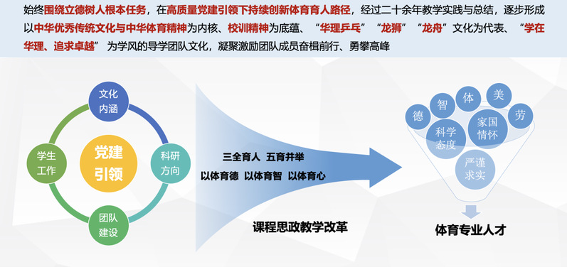 体育学院体育产业与健康管理导学团队自成立起,始终围绕立德树人根本任务,在高质量党建引领下持续创新体育育人范式,不断探索和深化加强导师队伍建设、构建和谐导学关系的路径和举措,有效形成党建学业共发展,成人成才共促进的育人模式。