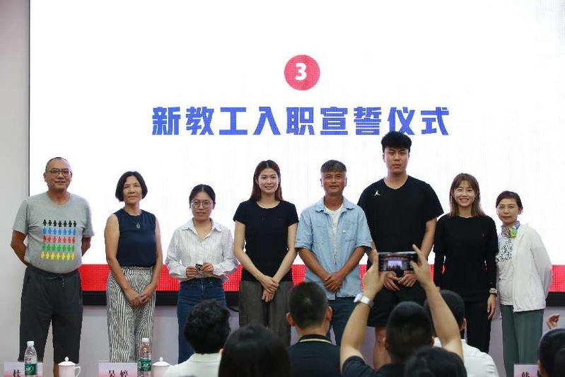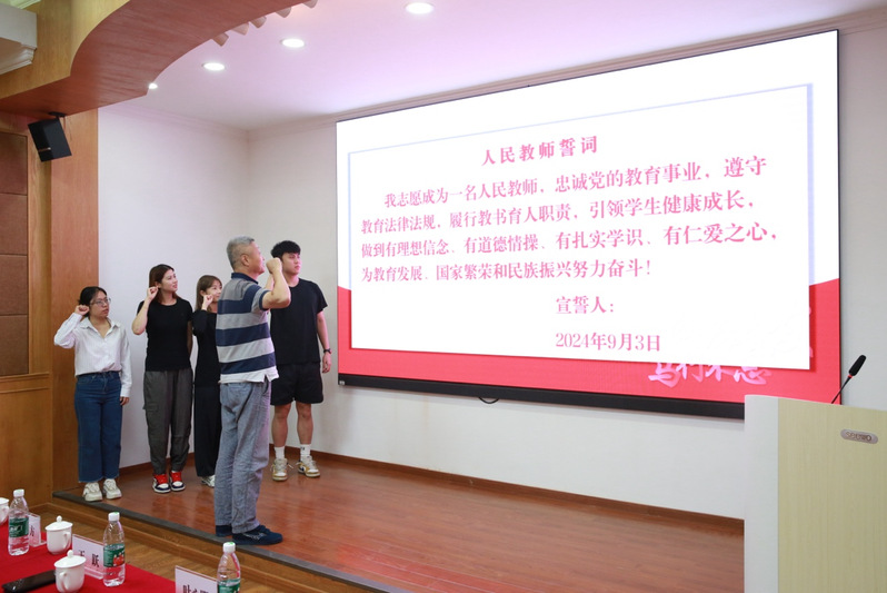 在第40个教师节来临之际,学院迎来了4位新教师,他们有国家级健将运动员,有清华大学等名校优秀博士毕业生。特别活动中还举行了新教师的入职欢迎仪式和入职宣誓仪式。学院4位老教师向新教师颁授校徽,欢迎他们正式成为华理体育人。韩骏带领新教师庄严宣誓,誓做一名光荣的人民教师。