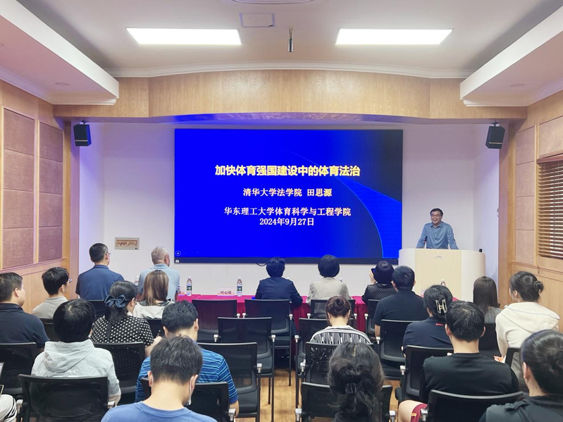 为深入贯彻落实党的二十届三中全会和全国教育大会精神,学习习近平法治思想,深刻领悟体育法治对体育强国建设的重要性,切实提高学院师生的体育法治意识和能力,近日,体育学院邀请清华大学法学院教授、体育法研究中心主任、《深入学习习近平关于体育的重要论述》编写组成员、《中华人民共和国体育法》(以下简称《体育法》)修改起草组副组长、博士生导师田思源,以“加快体育强国建设中的体育法治”为题,面向全体师生开展体育法治建设专题报告。学院领导班子成员、教师及研究生代表参加学习,报告会由学院党委书记徐文方主持。