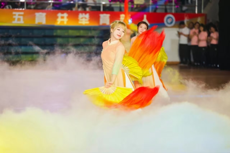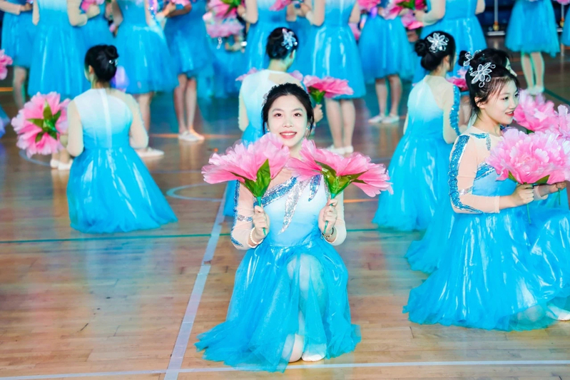 56个民族56朵花,花朵象征着各民族的美丽与希望,在中华人民共和国成立75周年之际,由体育学院余静老师指导健美操班女生带来团体操表演《同心共筑中国梦》,表达了年轻一代,肩负伟大复兴的决心,让青春在不懈奋斗中绽放绚丽之花。