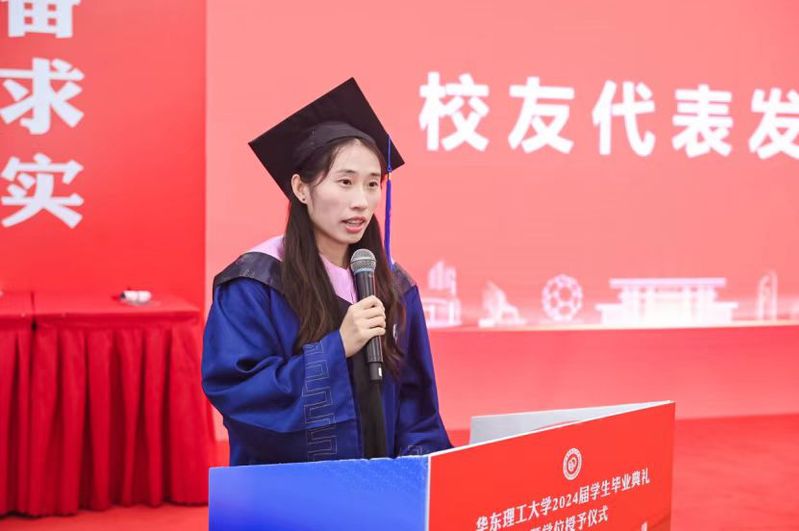 国贸运(200班)张誉薷代表全体本科毕业生发言,她回顾了自己在华理的学习实践经历与收获的成长,感谢了母校在自己追求真理的道路上提供的求知环境与内心激励,表达了自己将坚守校训精神,勇敢开拓广阔天地的奋斗决心。
