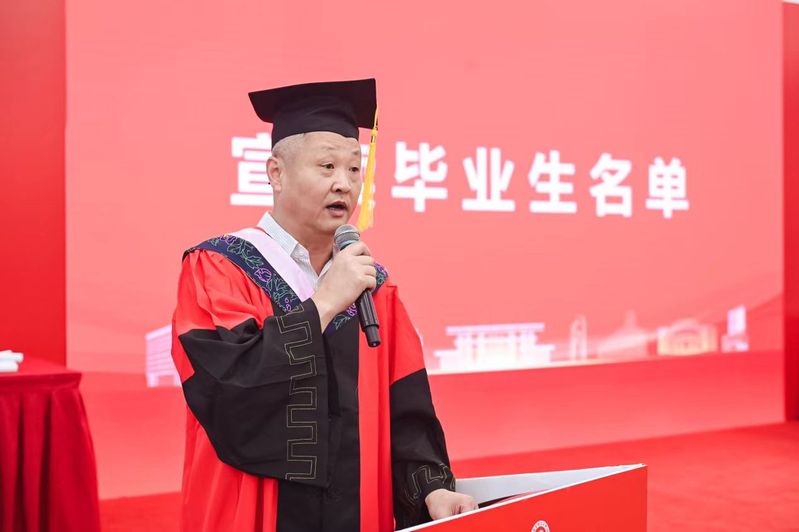 韩骏宣读了yl6809永利YL集团关于授予2024届本科生、研究生学位的决定,共有28人获学士学位,17人获硕士学位,并对顺利取得学位的同学表示热烈祝贺。
