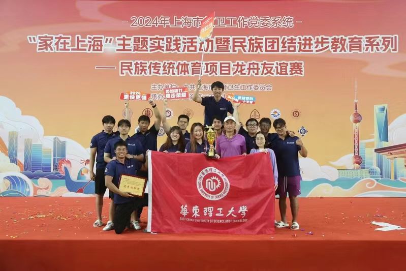 我校在主场举办龙舟系列赛事活动之外,还积极组织学生成立龙舟代表队参加市级比赛,主动宣传华理龙舟文化,增进高校友谊与民族团结。6月5日,我校来自维吾尔族、苗族等3个民族的14位学生组成的华理龙舟代表队,参加2024年上海教卫系统“家在上海”主题实践活动暨民族团结进步教育系列——民族传统体育项目龙舟友谊赛,同时获得一等奖和优秀组织奖荣誉称号,充分展现了华理龙舟的竞技实力,让以龙舟为代表的华理体育名片愈加鲜明。