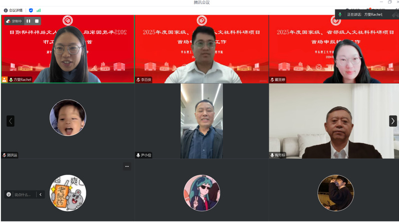 为做好2025年度国家级、省部级人文社科科研项目申报工作,不断提高项目申报质量,体育学院于11月29日召开国家级、省部级人文社科科研项目首场申报在线辅导讲座。会议特邀安徽医科大学陶芳标教授、上海应技大尹小俭教授参会指导并做讲座。体育学院院长叶心明、拟申报2025年国家级人文社科科研项目的教师代表以及研究生学生代表参会。会议由科研秘书方雯博士主持。