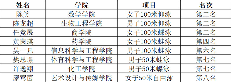 游泳专项赛个人赛获奖名单