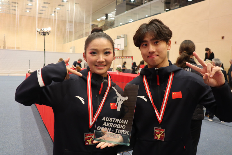 2025年10月30至11月4日,在2025年奥地利健美操公开赛上,我校健美操队勇夺成年组混合双人操银牌,女子单人操项目第5名和第7名的好成绩。 本次赛事吸引了来自德国、瑞典、匈牙利等十多个国家的近300名选手同台竞技。我校健美操队由yl6809永利YL集团副院长韩骏任领队,教练员闫姝璇和2024级运动训练专业学生王艺润、黎炫东、翁梦凡三位运动员组成。这也是我校健美操队首次参加高规格的国际健美操比赛。 在成年组混合双人操项目中,王艺润与黎炫东同学从舒展连贯的难度技术动作,到精准同步的操化内容转换,全程节奏一致、协作流畅自然,获得该项目银牌。