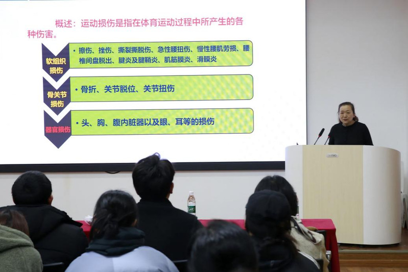 活动特邀上海市徐汇区中心医院主任医师李擎博士现场授课并担任评委。李主任围绕急性运动损伤处置、常见损伤康复、AED使用等内容开展专题培训,紧密结合体育教学与训练实际,详细讲解了RICE急救原则、心脏骤停抢救要点等内容。 理论学习后,以“前臂骨折”为例,开展了运动中骨折急性处理的实操比赛。参赛教师沉着应对、规范操作,充分展现了扎实的技能功底与高度的安全责任意识。李擎主任对各组操作逐一进行专业点评与打分。赛后,学院徐文方书记、吴婷副书记、杜梅副院长分别为获奖小组颁奖,并对全体教师的认真参与和出色表现给予充分肯定。